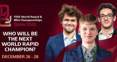 25 – 31 დეკემბერს ყატარში იმართება მსოფლიო ჩემპიონატი სწრაფ და ელვისებურ ჭადრაკში. ჩემპიონატში მონაწილეობს 50-ზე მეტი ქვეყნის 400-მდე მსოფლიოს უძლიერესი მოჭადრაკე. ჩემპიონატის საპრიზო ფონდი ...