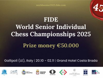 20 ოქტომრიდან 2 ნოემბრის ჩათვლით იტალიაში იმართება მსოფლიო სენიორთა ჩემპიონატი +50 და +65 ასაკობრივ კატეგორიებში. ჩემპიონატი იმართება შვეიცარიული სისტემით 11 ტურად და მონაწილეობს 64 ... -